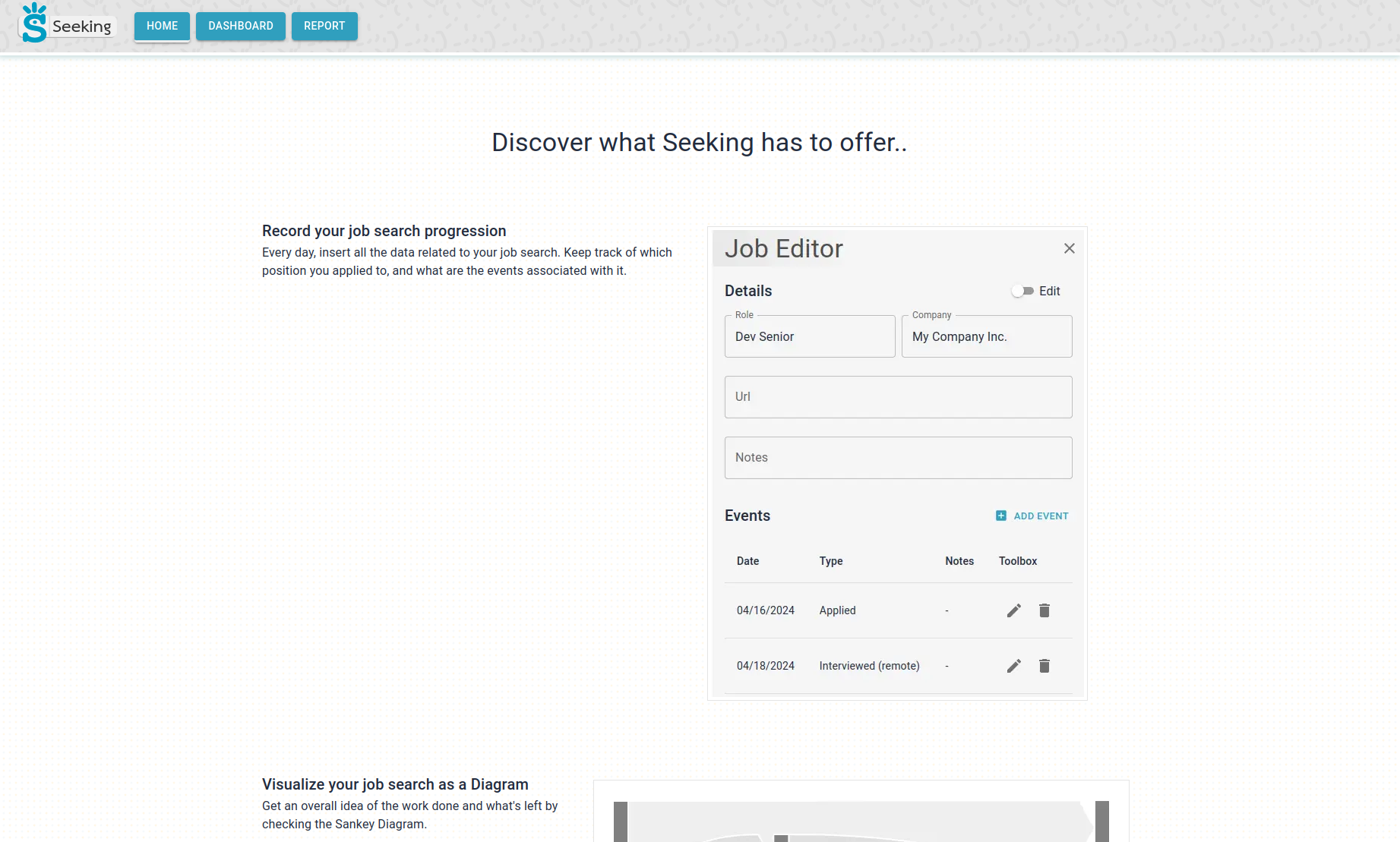 Seeking is a Job Search Manager, which allows you to record, track, and view your job search journey.